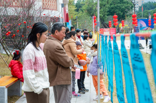 2月12日下午,福建省图书馆东区小广场上数百条彩色谜笺迎风展开,一场元宵灯谜会还未开场,早已有不少热切的读者围拢过来:或仰头细读谜面,或举笔在纸上圈画,孩子们穿梭其间嬉笑着,欢声笑语中洋溢着浓浓的节日氛围。