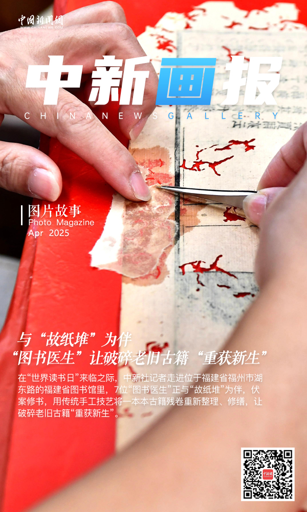 拆线、配纸、补洞、溜口、修剪、上皮、订线、压平……修复一本古籍所需要的时间,短则几天,长则数月。在“世界读书日”来临之际,中新社记者走进位于福建省福州市湖东路的福建省图书馆里,7位“图书医生”正与“故纸堆”为伴,伏案修书,用传统手工技艺将一本本古籍残卷重新整理、修缮,让破碎老旧古籍“重获新生”。
