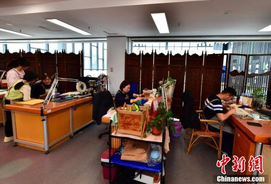 福建省图书馆唯一男“书医”、“80后”古籍修复师郑楠华(右一)正在伏案修书。