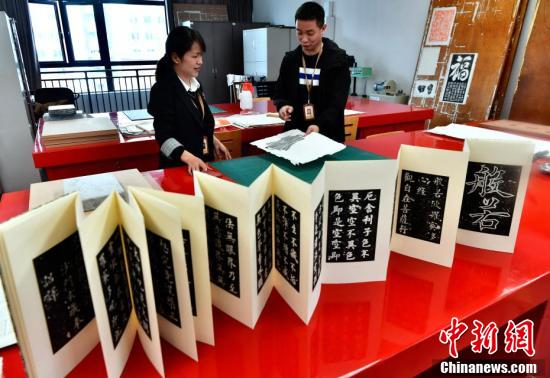 修复组唯一男“书医”、“80后”古籍修复师郑楠华(右)正在与福建省图书馆特藏中心修复组组长林凤交流拓片册页制作技艺。