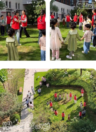 活动开篇,在借阅区外的草坪里,奥尔夫律动操《Chasiki》如冬日里的一束暖阳点亮全场。明快的节奏里,孩子们踮起脚尖、摆动双臂,每一个动作都踩着“迎冬储暖、食饺驱寒”的民俗韵律。他们在同步律动中感受同伴间的默契,稚嫩的脸庞上满是专注与笑意,不仅锻炼了身体协调性与肢体表现力,更让集体意识与规则感在轻松的互动中悄然扎根,冬日的活力与朝气在这里尽情流淌。