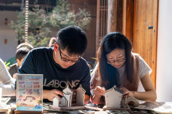 分享结束后,不少读者在“阅见厝里美学”主题书展前驻足,集中亮相的《福建古厝》《福州古厝》《闽南传统建筑》等精品著作,从宏观的聚落布局到细微的装饰纹样,全方位解码古厝营造智慧与文化积淀,让意犹未尽的听讲读者能够按图索骥,阅尽千年建筑美学。知识浸润之余,读者们还化身“临时工匠”,通过搭建古厝模型,感受在梁、柱、枋、椽的精妙咬合之间蕴含的古厝结构逻辑与巧思,让书本中那段深藏于历史的古厝搭建匠心与文化魅力,在亲手搭建的模型间重现。