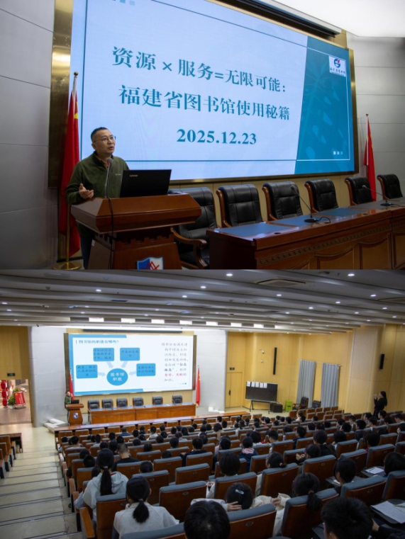签约仪式后,福建省图书馆参考咨询部刘煦赞主任开展了题为《资源×服务=无限可能:福建省图书馆使用秘籍》的主题讲座,系统介绍了省图书馆的百年沿革、丰富馆藏及多元服务,重点演示了文献检索、数字资源获取、线上平台使用等实用技能,生动阐释了图书馆作为“知识基础设施”与“社会教育平台”的多元价值。现场互动热烈,师生们纷纷表示收获颇丰,讲座不仅帮助大家解锁了“不知道的图书馆”,更掌握了高效利用公共文化资源的方法,为拓展知识边界、提升综合素养提供了有力支撑。