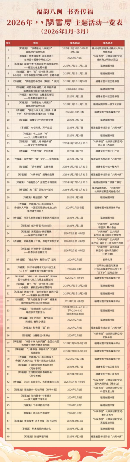 为学习贯彻习近平文化思想,贯彻落实习近平总书记在福建考察时的重要讲话精神和《全民阅读促进条例》,聚焦“提升文化影响力、展示福建新形象”,由福建省文化和旅游厅主办、福建省图书馆承办的“福韵八闽 书香传福”——2026年“八闽书房”主题活动将于1月27日正式启动。活动以“福”文化为主题,设置“知福”“传福”“享福”三大篇章,于1至3月活动期间共举办49场特色活动,通过主题讲座、专题书展、互动体验等多元形式,让市民读者们在书香中沉浸式了解、体验、享受“福”文化的精神内涵。