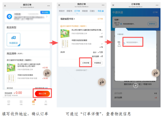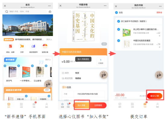 使用:选择心仪图书加入书架并填写收件信息,确认订单后即可享受快递送书上门,不需支付任何费用。阅读完毕后,可选择快递归还或到馆还书。