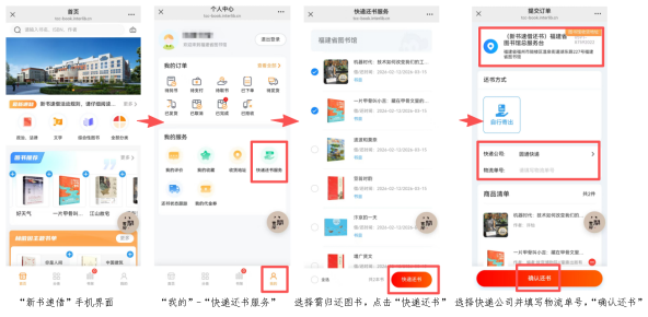 通过“八闽书房”智慧阅读平台-“好书免费读”栏目,或者通过“福建省图书馆”官方微信公众号-“微服务大厅”等端口,点击“新书速借”→右下角“我的”→“快递还书服务”→选择需归还图书→点击“快递还书”→选择快递公司并填写物流单号→“确认还书”。