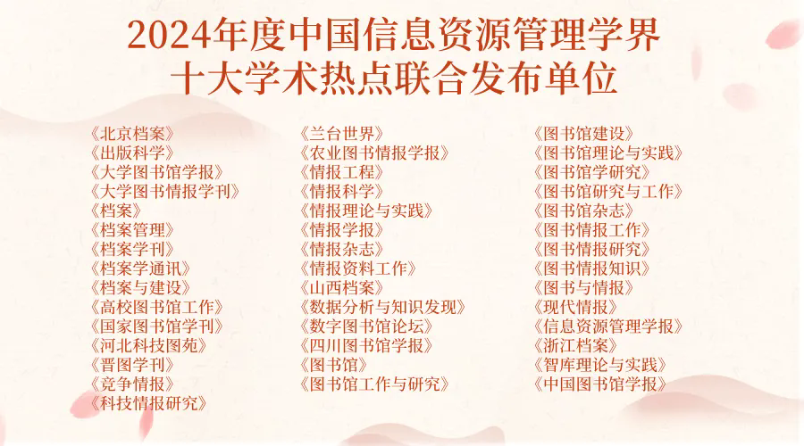 由中国人民大学书报资料中心、图情档39青年学者沙龙、复旦大学国家智能评价与治理实验基地联合主办的“2024年度中国信息资源管理学界十大学术热点”评选活动已经成功落下帷幕,备受学界和业界瞩目的2024年度中国信息资源管理学界十大学术热点新鲜出炉。